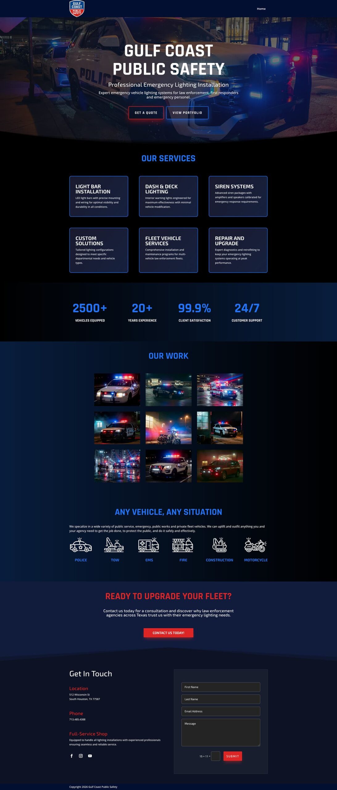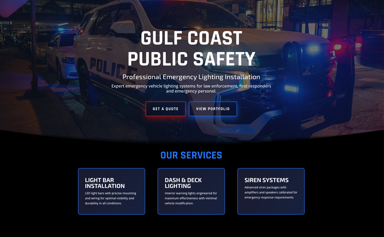 I helped Gulf Coast Public Safety set up hosting at another provider, saving them signifigant money each month. I redesigned their site with a modern asethetic and typograpghy, service areas, portfolio and a functional contact form. For direction, I leaned into the "red / blue" contrast of flashing police lights. Each section had red or blue accents and where possible I crafted CSS hover effects to switch between the two when interacted with. Commercial photography was also outside of their current budget, so I used realistic AI image generation prompting to create a series of "Emergency Vehicles" to demonstrate their light installation styles.