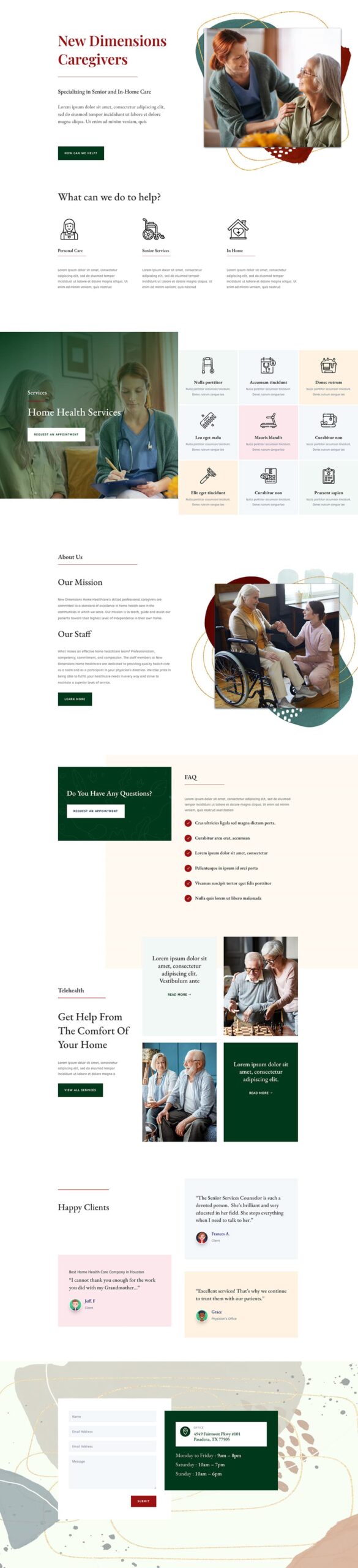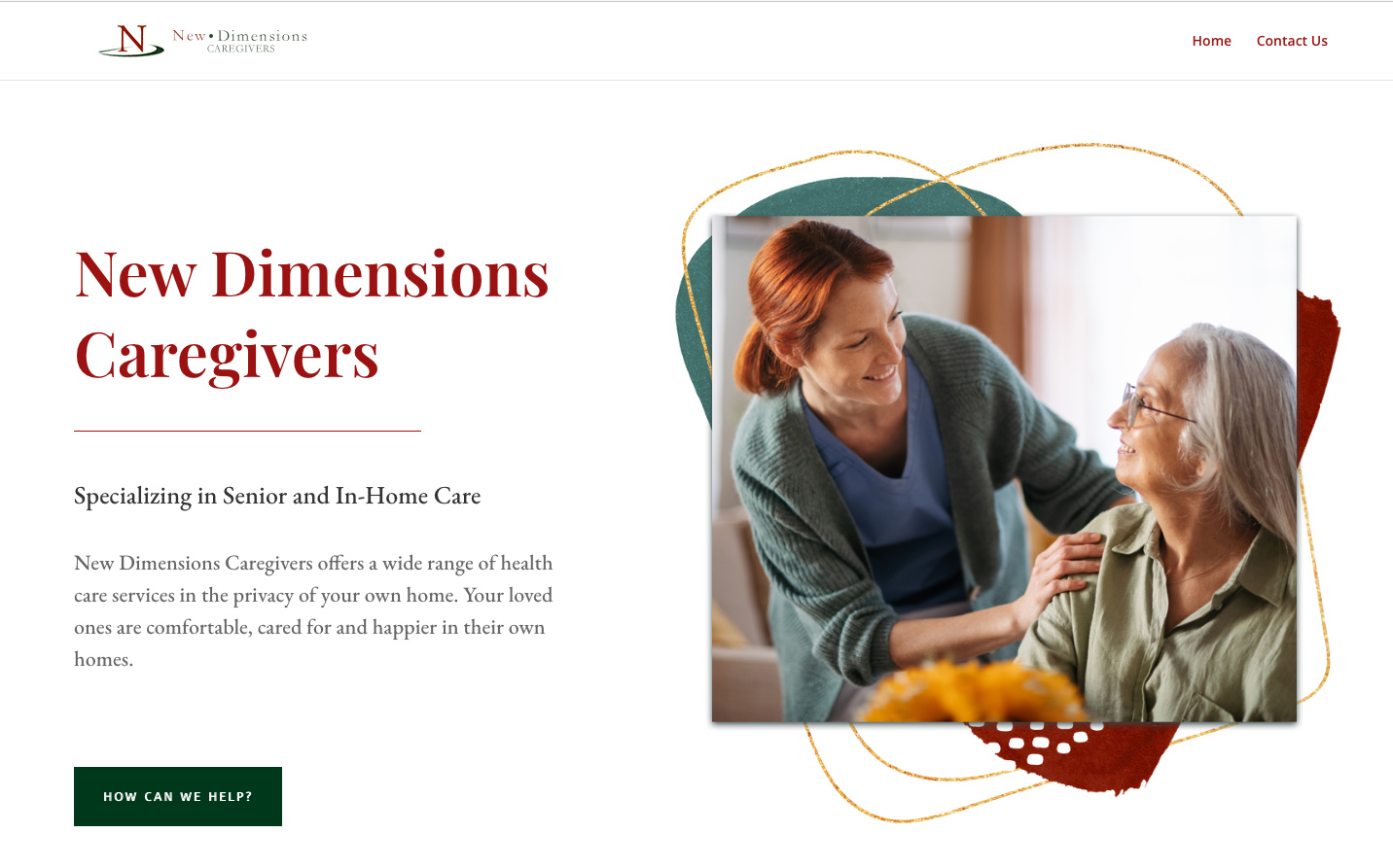 New Dimensions approached me to redesign they entire branding as well as their website. The only thing that carried over was the two colors (dark green and maroon) from their original logo. I developed a friendly yet modern design aesthetic and carried it through the website redesign, to appeal to older clients and the families who might require their services.